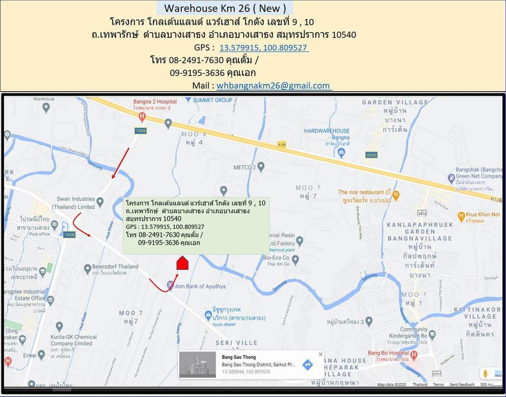 Warehouse Km 26 ( New ) โครงการ โกลเด้นแลนด์ แวร์เฮาส์ โกดัง เลขที่ 9 , 10 ถ.เทพารักษ์ ตำบลบางเสาธง อำเภอบางเสาธง สมุทรปราการ 10540 GPS : 13.579915,100.809527 (แสดงแผนที่) โทร 08-2491-7630 คุณตั้ม / 09-9195-3636 คุณเอก Email : whbangnakm26@gmail.com